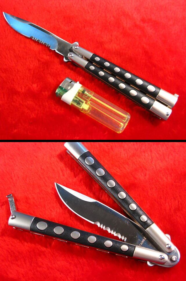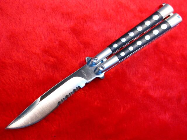 バタフライナイフ 5inch ハーフセレーション 半波刃 マットシルバー・BKハンドル (7126) 18歳以上 KANTAS